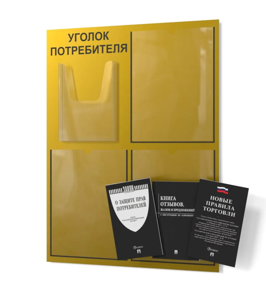 Уголок покупателя 490х650 3 кармана А4, 1 объмный карман А5 (желтый)