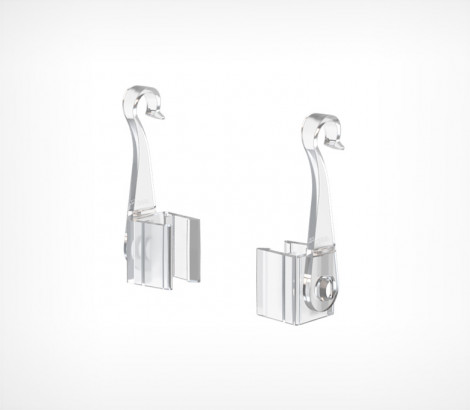 Крючок с подвижным основанием для подвешивания пластиковых рамок на подвесных профилях и металлических покупательских корзинах . Закрепляются с боковой стороны рамки. Для подвешивания одной рамки необходимо два крючка разной ориентации.