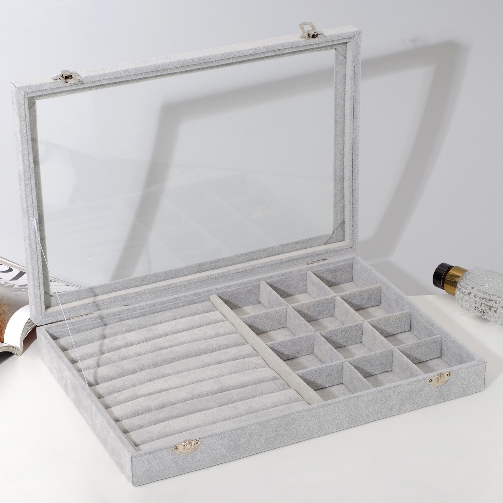 Планшет для бижутерии с крышкой 10 полос, 12 ячеек 350 мм (серый)